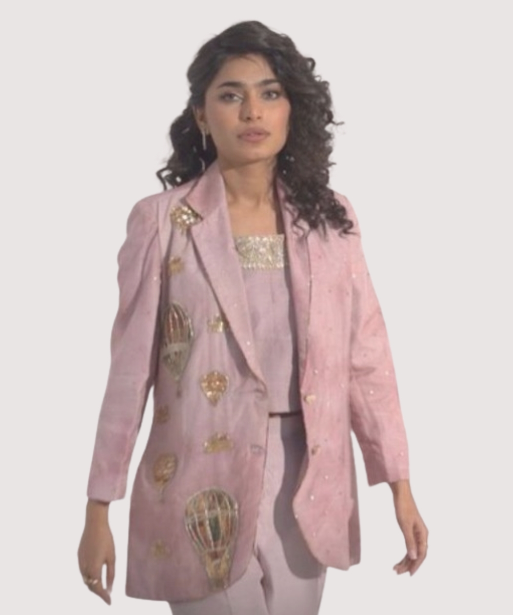 The outerwear is a stunning embellished blazer in rose pink, adorned with intricate detailing that catches the light and enhances the outfit’s luxurious appeal. The shimmering inner camisole complements the pastel tones, creating a harmonious balance of texture and shine. Paired with smooth, tailored rouhsilk trousers, this ensemble offers both comfort and grace, making it perfect for weddings, evening events, or any occasion where you want to make a lasting impression.