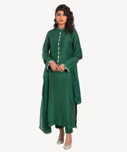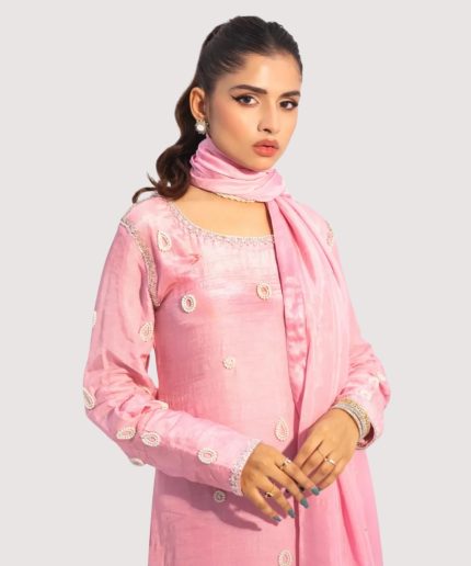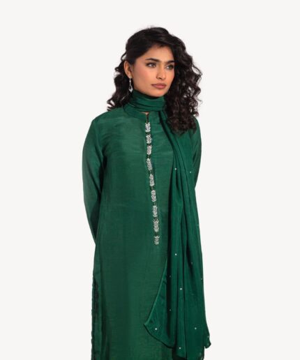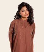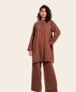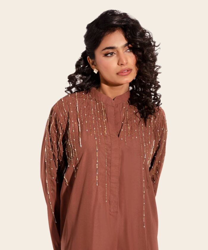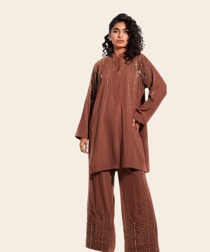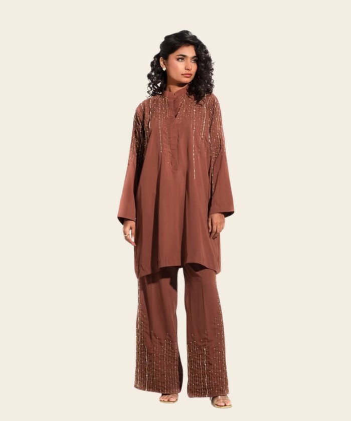 Meem Alif brings you a stunning two-piece set in a rich copper hue that radiates warmth and elegance. The ensemble features a relaxed-fit shirt adorned with intricate embellishments cascading down the front and sleeves, creating a dazzling effect that catches the light with every movement. Paired with wide-leg trousers boasting matching embellishments, this outfit strikes the perfect balance between opulence and sophistication.