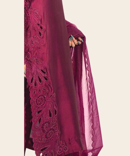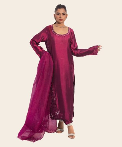Crafted from premium rousilk fabric, this elegant ensemble is designed to offer a soft texture and a graceful fall, ensuring both comfort and style. The sleeves and trousers are beautifully adorned with intricate embroidery and hand embellishments, adding a refined touch of sophistication. Completing the look is a lightweight organza dupatta, delicately accented with a fine work spray, enhancing its ethereal and polished appeal. Perfect for formal occasions and festive gatherings, this ensemble embodies timeless elegance.