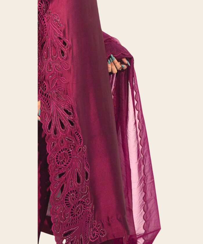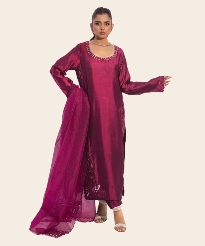 Crafted from luxurious tissue silk, this stunning outfit features exquisite cutwork detailing, elevated by intricate cutdana embellishments that add depth and shimmer. The neckline is adorned with sophisticated adda work and delicate stone string accents, enhancing its graceful allure. The matching organza dupatta, beautifully embroidered on all four corners, completes the look with a touch of refinement. This ensemble effortlessly blends tradition with modern elegance, making it a perfect choice for formal occasions and festive celebrations.