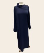 This navy blue long dress, crafted from signature crepe fabric, offers a soft and flowy drape that exudes effortless elegance. The unique asymmetrical cowl neckline, paired with button detailing on one shoulder, adds a sophisticated and modern touch to the design. Long sleeves with pearl button embellishments near the cuffs further enhance the dress’s refined appeal.