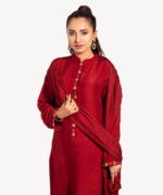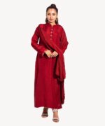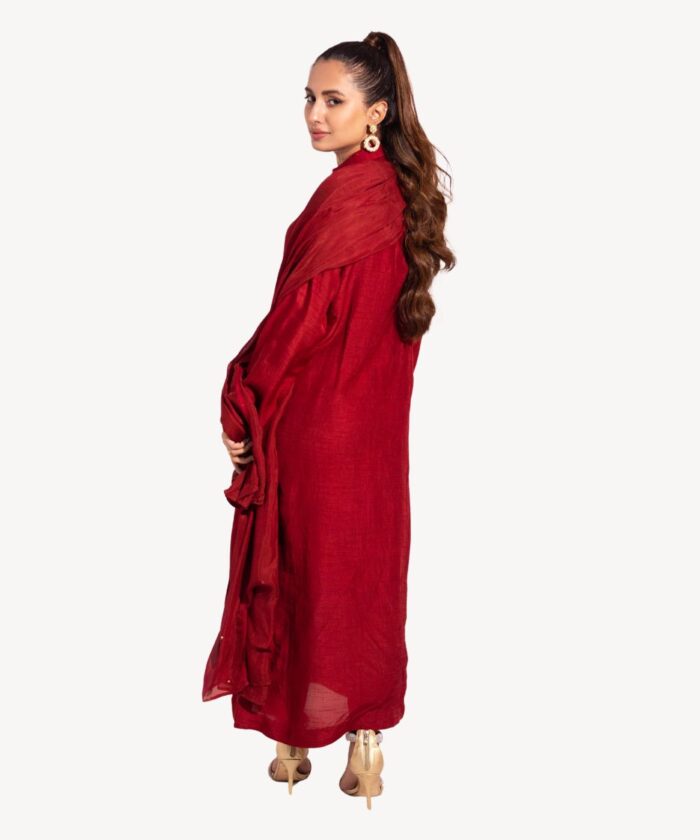 Exuding grace and sophistication, this traditional ensemble is crafted from premium Korean rousilk, ensuring a smooth and elegant drape. The front patti and sleeves are adorned with exquisite handcrafted adaa work, featuring shimmering stones and striking ruby accents that add a touch of festive charm. A silk dupatta with a delicate stone spray completes the look, bringing a luxurious and refined finish to this masterpiece. Perfect for formal gatherings and celebrations, this ensemble is a blend of timeless tradition and modern elegance.